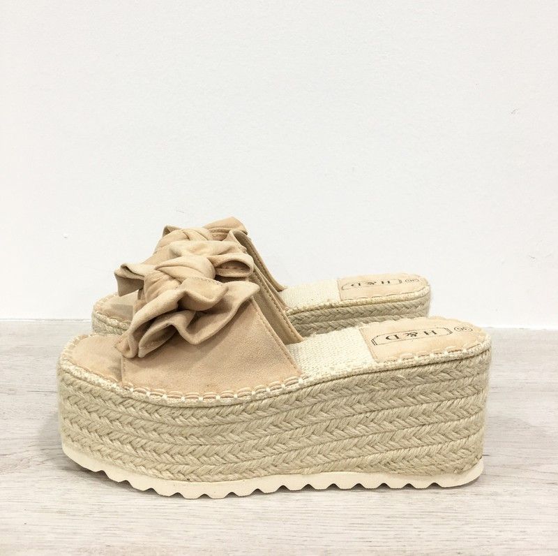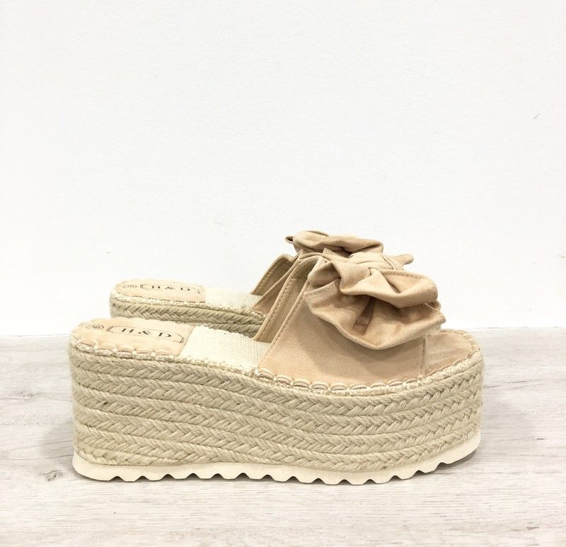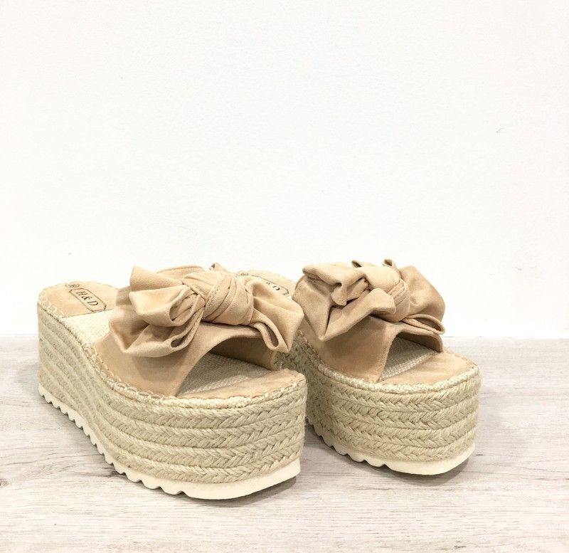 Sandalias con plataforma tipo pala para mujer. Material de antelina en color natural con lazo grande en el mismo tono. Fabricadas con planta carbónica, súper acolchada con gel.